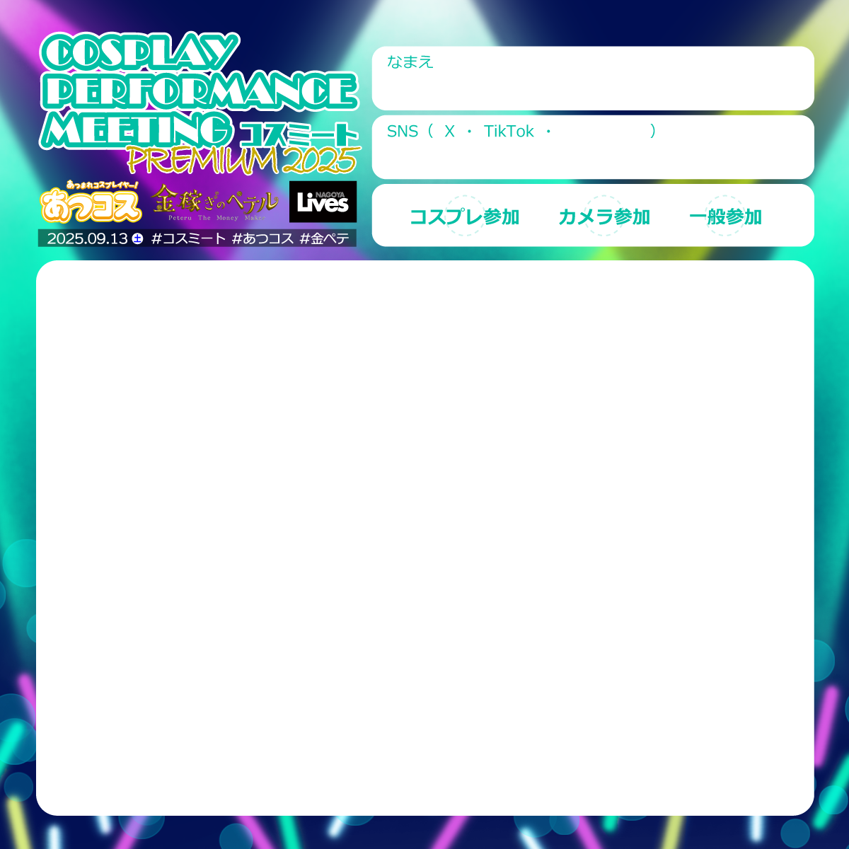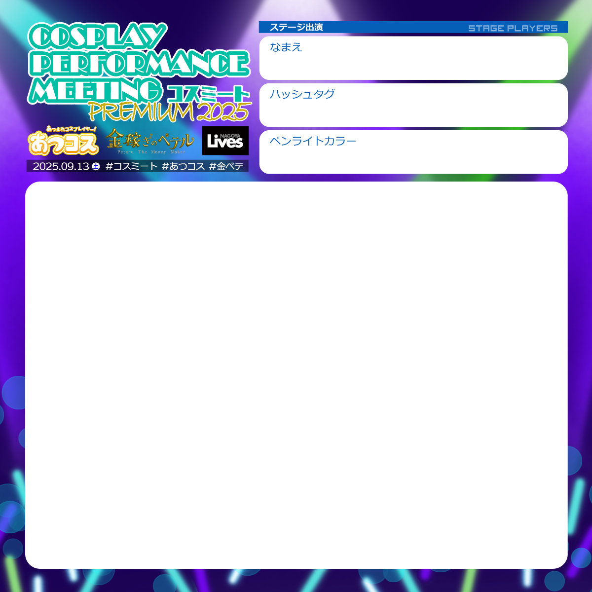 - コスプレ衣装や小道具に関するルールは「コスミートイベント参加規約」に準じます。