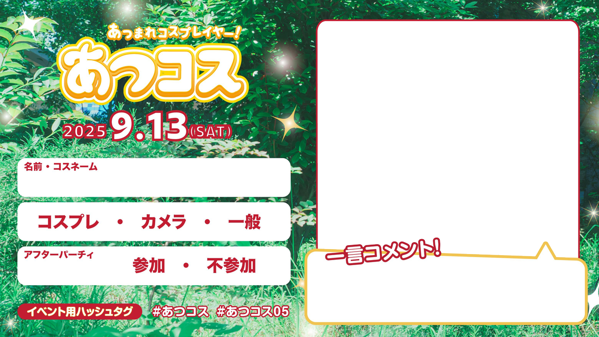 ※コスプレ、カメラマン参加者は「あつコス」イベント参加チケットが必要です