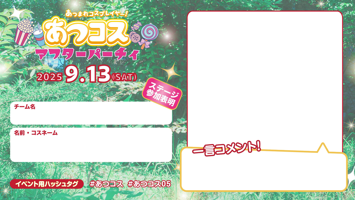 - 出演確定後に出演者用専用のチケット購入ページをご案内しますので、あつコスイベントページ内での販売チケットと重複購入されないようご留意ください。既にご購入済みの場合は精算対応を致します。