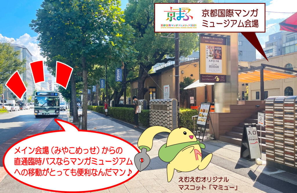 京まふメイン会場(みやこめっせ)から京都国際マンガミュージアムまで直通臨時バスが運行されます。