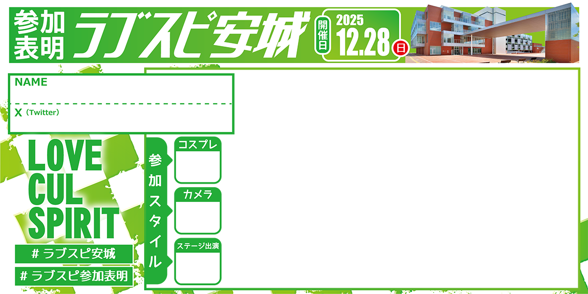- コスプレ衣装や小道具に関するルールは「ラブスピ安城 参加注意事項/コスプレ参加注意事項」に準じます。